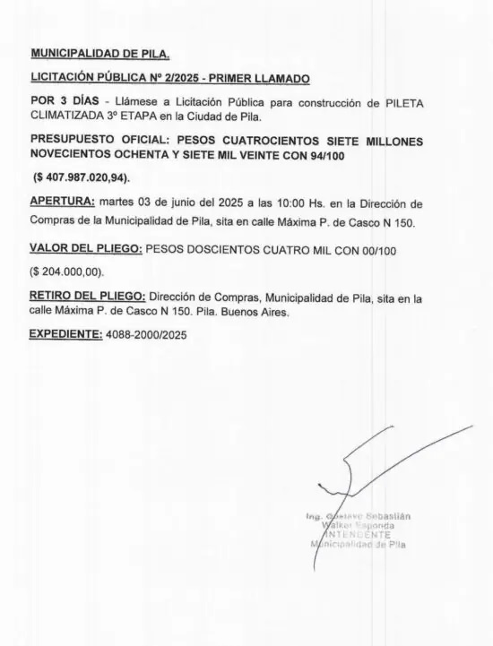 La Municipalidad de Pila abrió el llamado a Licitación Pública N° 2/2025 para llevar adelante la tercera etapa de construcción de la pileta climatizada en la ciudad. Se trata de una obra de gran importancia para el desarrollo deportivo y social del distrito.