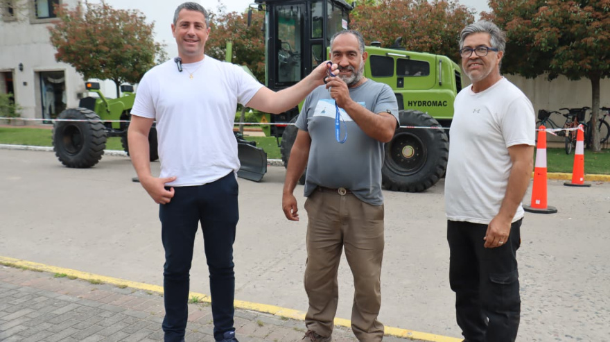 El intendente Sebastián Walker realizó la entrega de una nueva Motoniveladora al director de Servicios Urbanos Julián Cuestas.