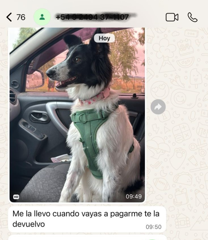 Torres, en un claro estado de nerviosismo, intentó primeramente romper la camioneta de Poggi pero, al no lograrlo, se llevó secuestrada a su perra Nina, y le dijo mediante un mensaje de whatsapp, “me la llevo, cuando vayas a pagarme te la devuelvo”. Asimismo, mediante audio amenaza que “la perra tiene sed”, generando mayor angustia en su tutor, tal como se señala en el audio que acompaña esta nota.