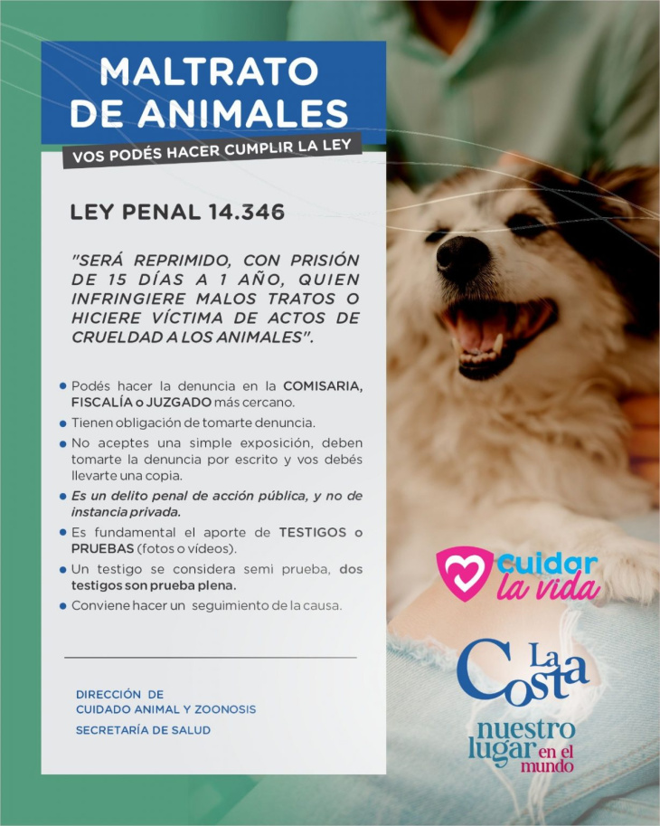 En el marco de la iniciativa “Cuidar la Vida”, la campaña de difusión hace referencia a la Ley Penal Nº 14.346, que establece sanciones de prisión para quienes incurran en actos de crueldad o maltrato hacia los animales.